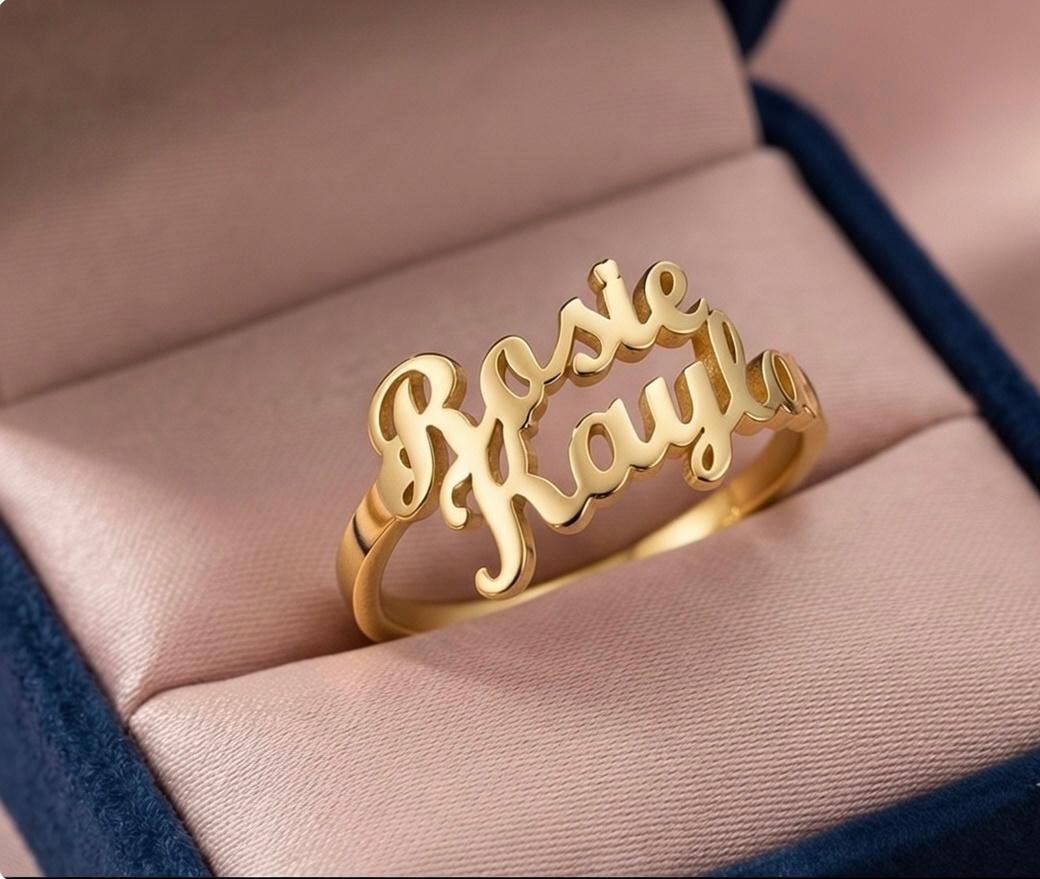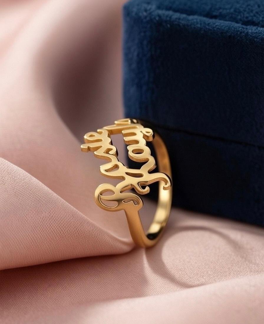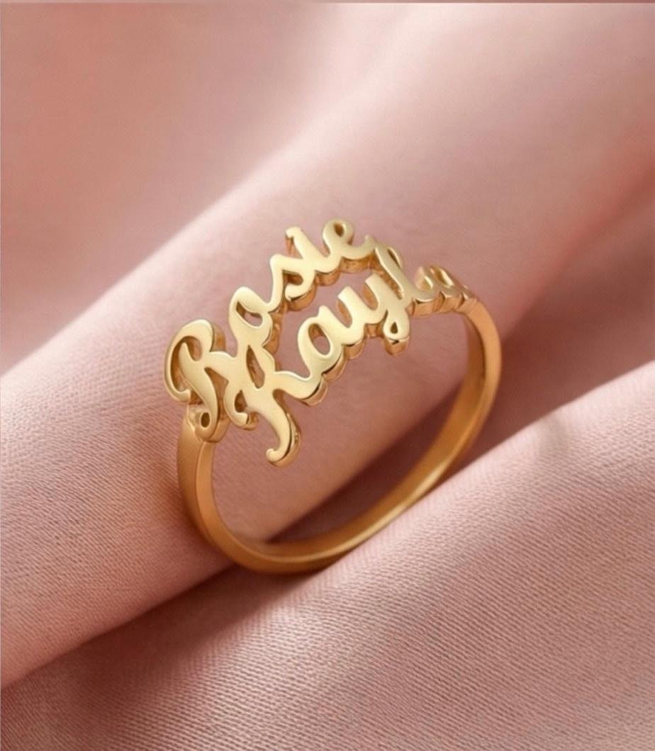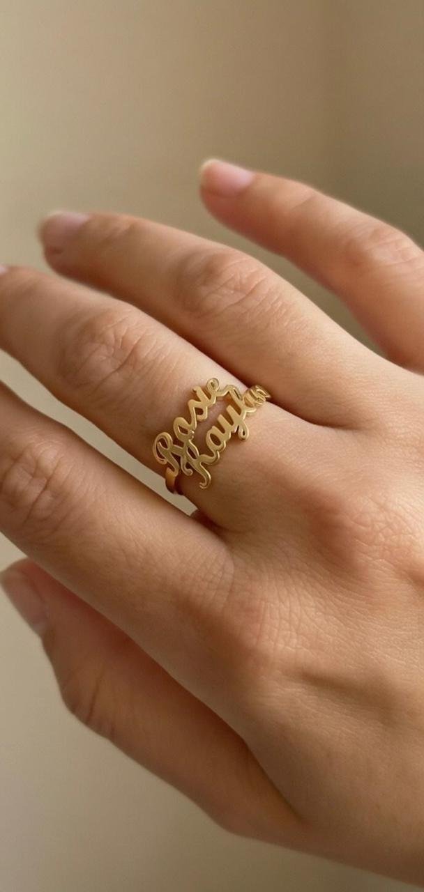 Expertly crafted with a clean, flowing script, this ring allows you to personalize it with names that tell your story. Finished in premium gold plated or silver plated metal, it offers a refined shine with an anti-tarnish, skin-safe coating, making it comfortable for daily wear by both men and women.